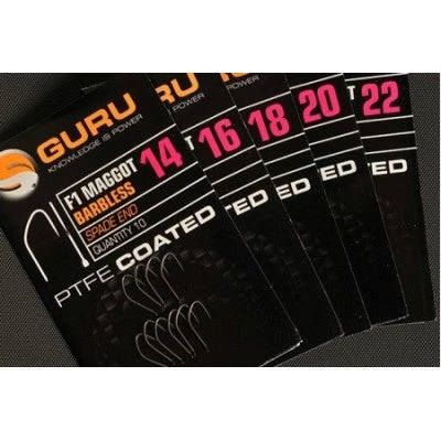 These new high quality hooks from Guru, have a fine wire and are designed for F1 fishing with maggots. The special shape will result in more hit bites and the protective PTFE coating protects the hook from damage.