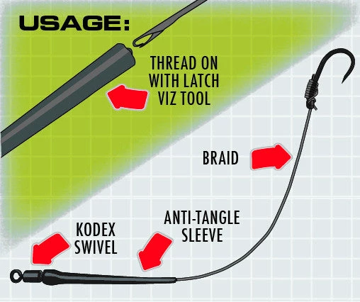 These sleeves are used at the swivel end of your rig length. They make sure your rig stays stiffer on the cast and they push your rig away from the lead when on bottom, allowing better rig presentation. They are ideal for attaching to softer hook-link materials like braid. Available in four colours that match Kodex tail rubbers and lead clips