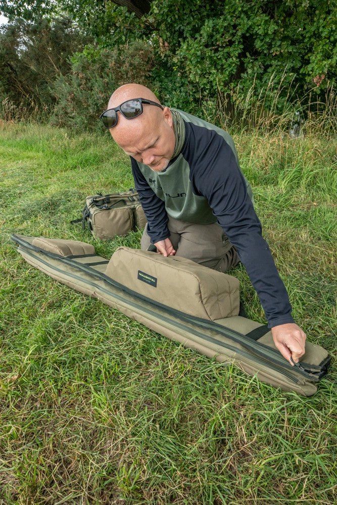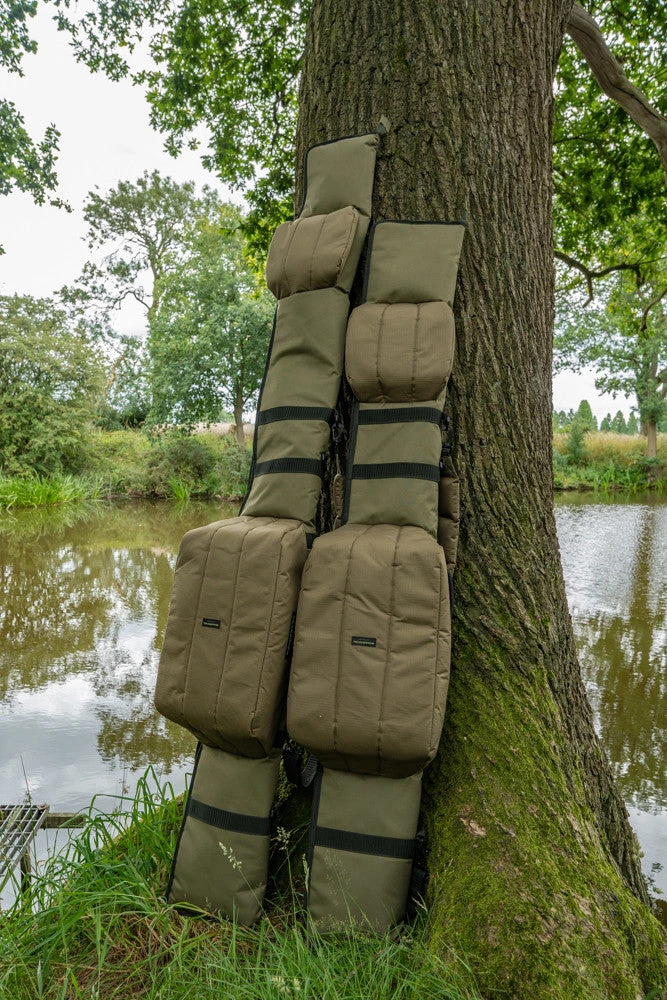These rod holdalls provide loads of protection for made-up rods and reels. There’s a highly padded area for three setups on the inside, plus a large outer pocket for your landing net and handle. The padded shoulder strap is adjustable, and the carry handle makes life easy on the bank. Increased protection offered for rod guides due to the bumped section at the top of the holdall – a great, simple way to transport your gear.