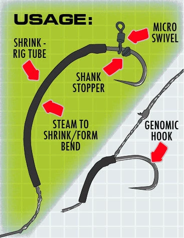 Available in four translucent colours this 1.6mm diameter shrink tubing is the perfect size for going over the eye of hooks and creating a ‘kicker’. This will ensure your hook turns on the take, giving maximum hooking penetration and stopping blow-outs. Kodex shrink-rig has more than a 50% shrink ratio!