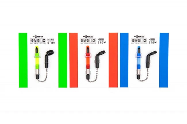 This is a smaller version of the famous Stow bobbins, which were developed on the banks of Elstow Lake and have been used by many members of Team Korda for years. The principle behind this bobbin is that it can be fished with both tight and slack lines, and when you get a take, the line releases from the clip on the side of it. For that to happen the stainless steel ball chain which it is fitted to needs to be the same length as your bite alarm, and a detachable connector system allows you to easily adjust it so that it is compatible with any buzzer (it comes set at the correct length for use with something like a Delkim, or similar sized alarm). It comes fitted with a stainless steel weight, but the 6g and 8g Overweights, which are sold separately as part of the Stow range, can also be used with it. The Basix Mini Stow can be fitted with a Mini Isotope (available in seven different colours), and is fitted below your bite alarm using a moulded hockey stick, which the ball chain screws into. It is available in a choice of red, green or blue.