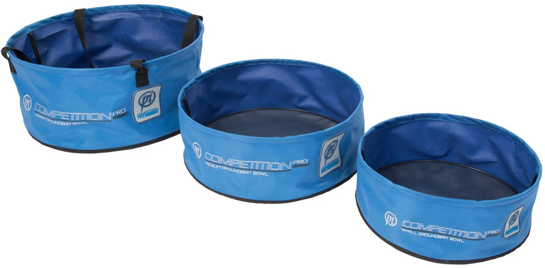 Three NEW bowls in the Competiion Pro range. Hard wearing wipe clean bait bowls suitable for mixing and storing groundbait. Collapsible for easy storage and transportation and featuring a stiff top ring to ensure rigidity whilst in use. Ideal for both commerical and natural venues.