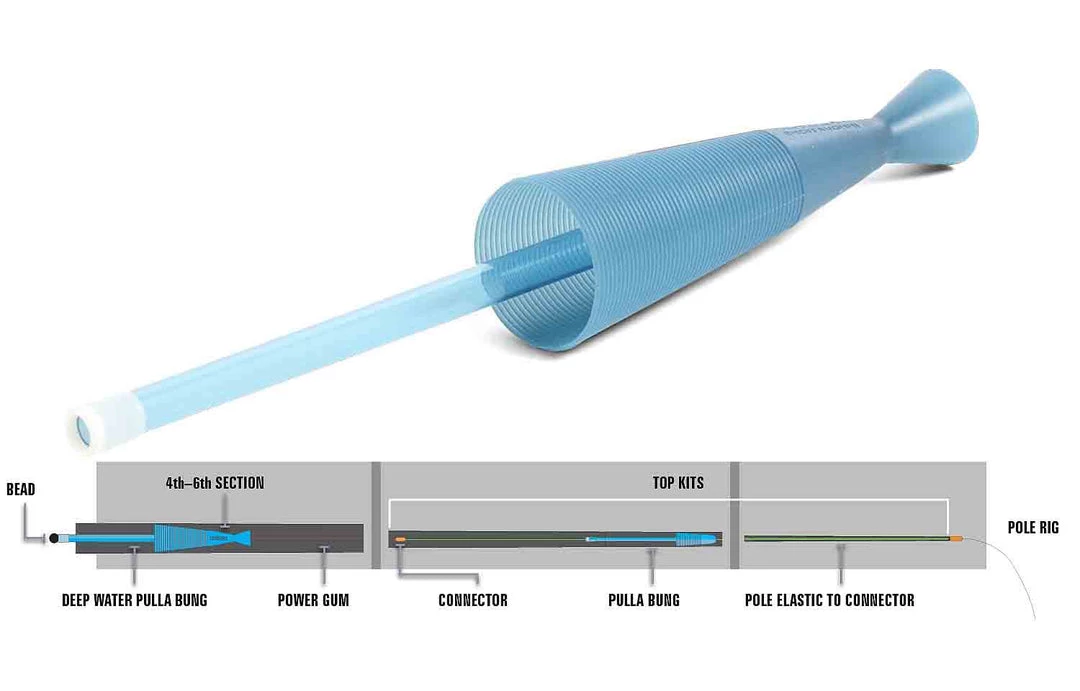 The large bung has been sized to fit all sections from 4 through to 6. Designed to be used in conjunction with the original Pulla Bung, this new version features a tapered lead in to allow for a Hollo connector to easily pass through it. Supplied with 4m of Power Gum , which is simply cut to the length required, threaded through the 4th section with the aid of a cross lock rod, and attached to the pole elastic at the original Pulla bung via the supplied Hollo connector, allowing the elastic to be pulled through in the conventional way. The added benefit of this system is that it can be connected at the peg and detached after each use, meaning there is no need to set aside separate kits for this style of fishing.
