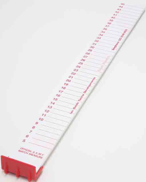 White plastic fish measure, 45cm long. Clear red printing with end stop.